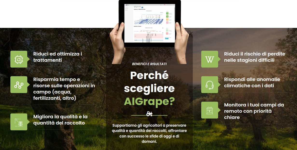 Il Progetto AI-Grape supporta gli Agricoltori nell’ottimizzazione della difesa fitosanitaria di Vite o Olivo per preservare quantità e qualità dei raccolti anche in annate difficili. Offriamo informazioni, formazione e consulenza (best practice) nell’utilizzo di soluzioni tecnologiche ed IA (Intelligenza Artificiale) che permettono di ridurre ed ottimizzare i trattamenti in campo, riducendo costi, tempo ed impatto ambientale.